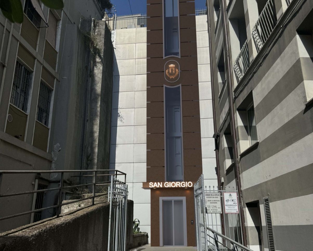 Particolare attenzione è stata riservata anche all’aspetto estetico e architettonico: l’ascensore sarà inserito in una struttura metallica antisismica rivestita in lamiera verniciata effetto corten, con tagli panoramici e illuminazione notturna a Led. Ai due sbarchi del nuovo ascensore della Spezia saranno installate pensiline retroilluminate con la scritta San Giorgio.