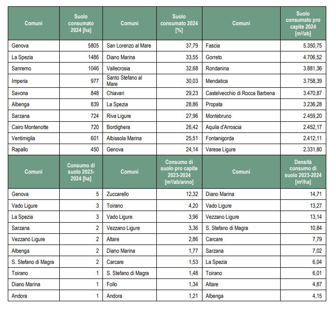 Complessivamente il suolo consumato in Liguria al 2024 è pari a 39.524 ettari, pari al 7,30% dell’intero territorio. La percentuale resta, quindi, sopra al dato medio nazionale che è pari al 7,17%.