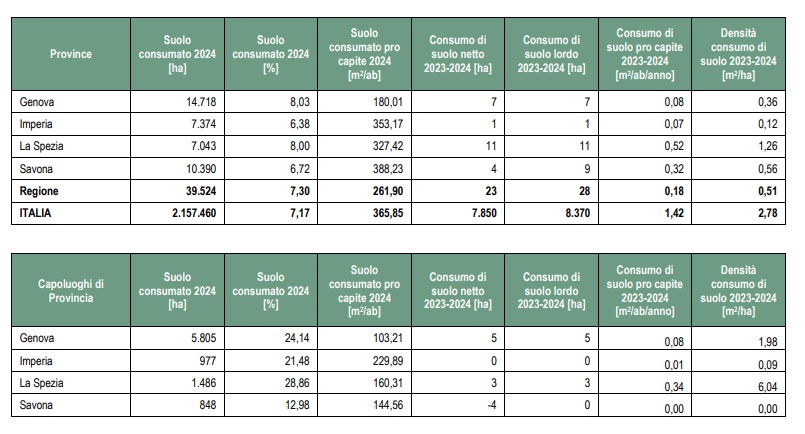 La Liguria rallenta nel consumo di suolo: dal 2023 al 2024 l’aumento delle nuove superfici artificiali è stato di soli 28 ettari pari a un incremento percentuale dello 0,07%, il migliore dato nazionale. Inoltre dal 2023 al 2024 in Liguria sono stati ripristinati 5 ettari di suolo, principalmente aree di cantiere che sono state recuperate.