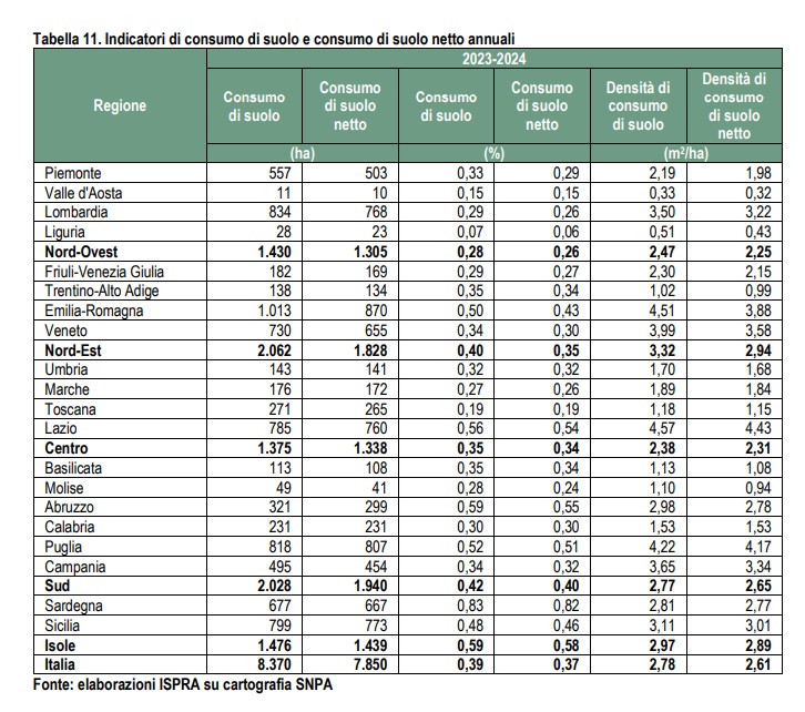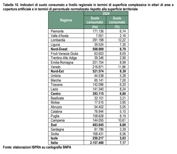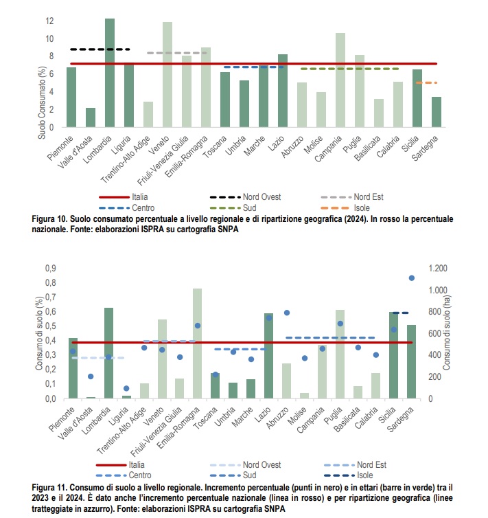 Al 2024 in 15 regioni risulta ormai consumato più del 5% di territorio, con massimi in Lombardia (12,22%), Veneto (11,86%) e Campania (10,61%). Anche la Liguria con il 7,30% supera questo limite. Il maggiore consumo di suolo annuale si osserva in Emilia-Romagna, che, con poco più di 1.000 ettari consumati (86% di tipo reversibile), è la regione con i valori più alti sia per le perdite sia per gli interventi di recupero, in Lombardia (834 ettari), Puglia (818 ettari), Sicilia (799 ettari) e Lazio (785 ettari). La crescita percentuale maggiore dell’ultimo anno è avvenuta in Sardegna (+0,83%), Abruzzo (+0,59%), Lazio (+0,56%) e Puglia (+0,52%), mentre l’Emilia-Romagna si ferma al +0,50%.