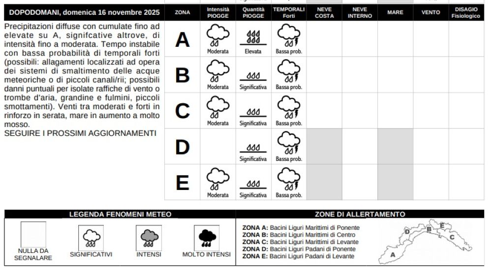La Sala Operativa Regionale resterà aperta per tutta la durata dell’allerta. In caso di eventi intensi, durante l’allerta sarà pubblicato il monitoraggio sul sito https://allertaliguria.regione.liguria.it/