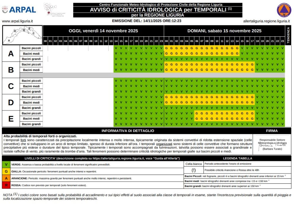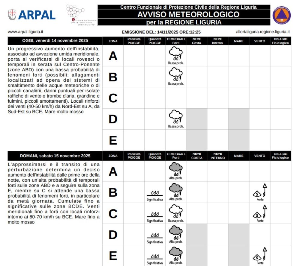 Arpal ha emanato allerta gialla per temporali sul centro ponente regionale (zone ABDE) per domani, sabato 15 novembre.