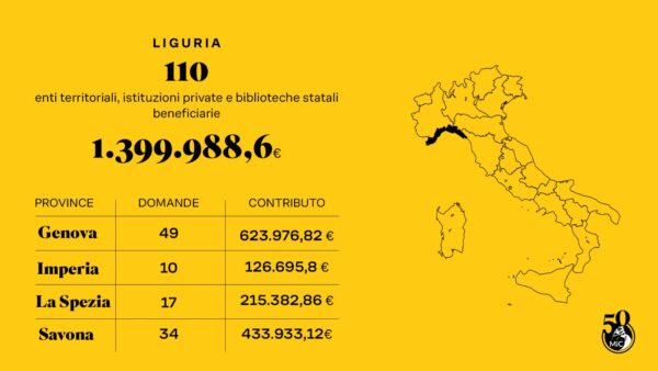 Per il biennio 2025/2026 il plafond previsto per il contributo è pari a 60 milioni di euro. Alle biblioteche della Liguria sono stati assegnati circa 1,4 milioni di euro, per 110 progetti.