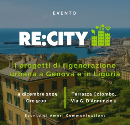 Venerdì 5 dicembre, con inizio alle 9, a Genova, alla Terrazza Colombo, prenderà il via “Re:City-I progetti di rigenerazione urbana a Genova e in Liguria”, evento dedicato alla riqualificazione del territorio ligure, ideato e organizzato da Ameri Communications, a Terrazza Colombo. In un momento in cui città e territori sono chiamati a rispondere alle sfide ambientali, sociali ed economiche, Re:City mette al centro i progetti realizzati, in corso e futuri a Genova e in Liguria, creando uno spazio di dialogo operativo tra istituzioni, imprese e progettisti.