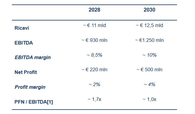 Ricavi ed ebitda al 2030 in crescita rispettivamente del 40% e 90% rispetto al 2025, utile netto 2030 a 500 milioni di euro, forte accelerazione del percorso di deleveraging trainata da generazione di cassa.