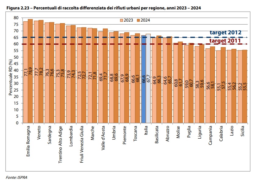 La percentuale di raccolta differenziata, nel 2024, si attesta al 67,7% della produzione nazionale, con una crescita