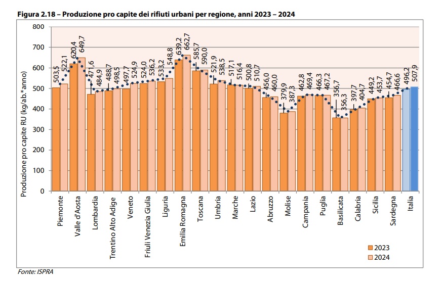 La produzione nazionale dei rifiuti urbani nel 2024 sale del 2,3%, attestandosi a poco più di 29,9 milioni di tonnellate (+664 mila tonnellate rispetto al 2023) e ogni cittadino italiano ha prodotto, in media, 508 chilogrammi di rifiuti. La produzione aumenta in particolare al Nord (+3,7%), meno al Centro (+1,2%) e al Sud (+0,8%). In valore assoluto, il Nord Italia produce quasi 14,7 milioni di tonnellate, il Centro 6,3 milioni di tonnellate e il Sud 8,9 milioni di tonnellate.