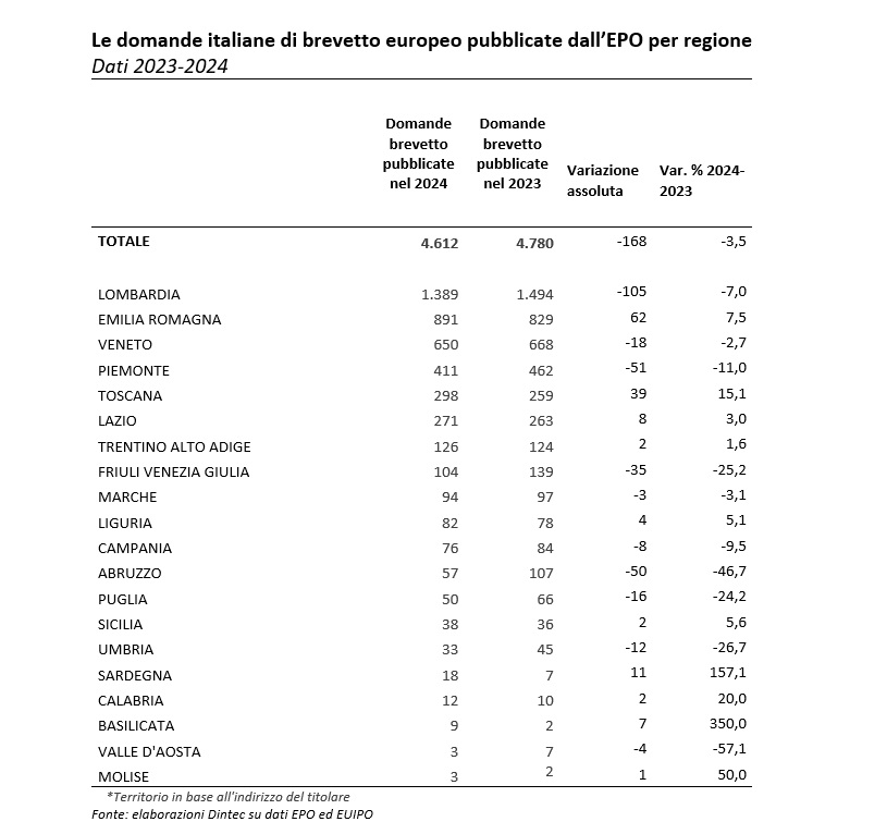 A livello regionale, Lombardia, Emilia-Romagna, Veneto, Piemonte e Toscana, prime in classifica per numero di domande pubblicate presso l’Epo, assommano quasi l’80% delle domande in Europa. Rispetto allo scorso anno, invece, i saldi più consistenti si registrano in Emilia-Romagna (+62), Toscana (+39), Sardegna (+11), Lazio (+8) e Basilicata (+7).