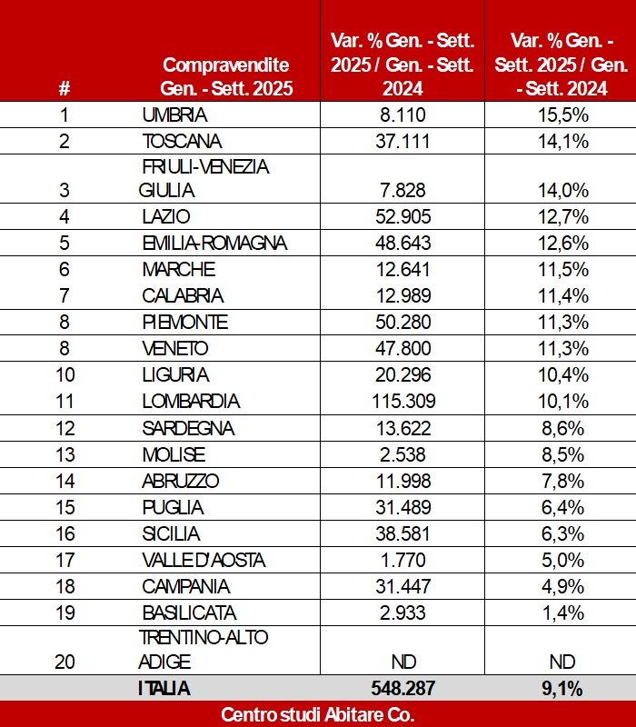 Nei primi 9 mesi del 2025, il mercato immobiliare residenziale in Italia continua a mostrare segnali di dinamismo, raggiungendo 548.287 compravendite (+9,1% rispetto allo stesso periodo dello scorso anno). Anche la Liguria ha registrato un aumento delle compravendite del +10,4% rispetto allo stesso periodo dell’anno precedente, un dato che posiziona la regione al 10° posto per variazione percentuale.
