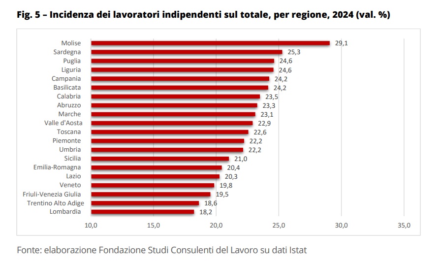 Tra le regioni che presentano la più alta propensione al lavoro in proprio vi sono, dopo il Molise (29,1%), Sardegna (25,3%), Liguria e Puglia (entrambe a 24,6%).