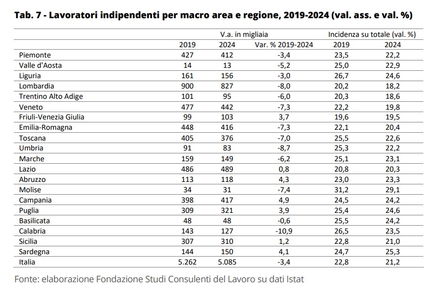 A livello geografico le dinamiche sono state molto differenziate. Al Nord e, in misura meno netta al Centro, si è registrata una contrazione significativa del numero dei lavoratori autonomi (oltre il 6%), riconducibile all’intensificazione dei processi di strutturazione aziendale e di assorbimento dell’occupazione in forme di lavoro dipendente, grazie anche alla crescente attrattività del lavoro subordinato in un contesto caratterizzato dalla crescente di profili qualificati.