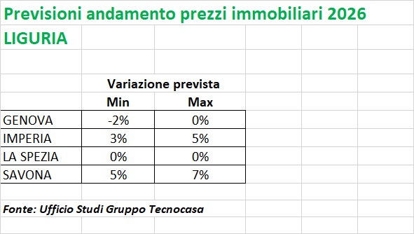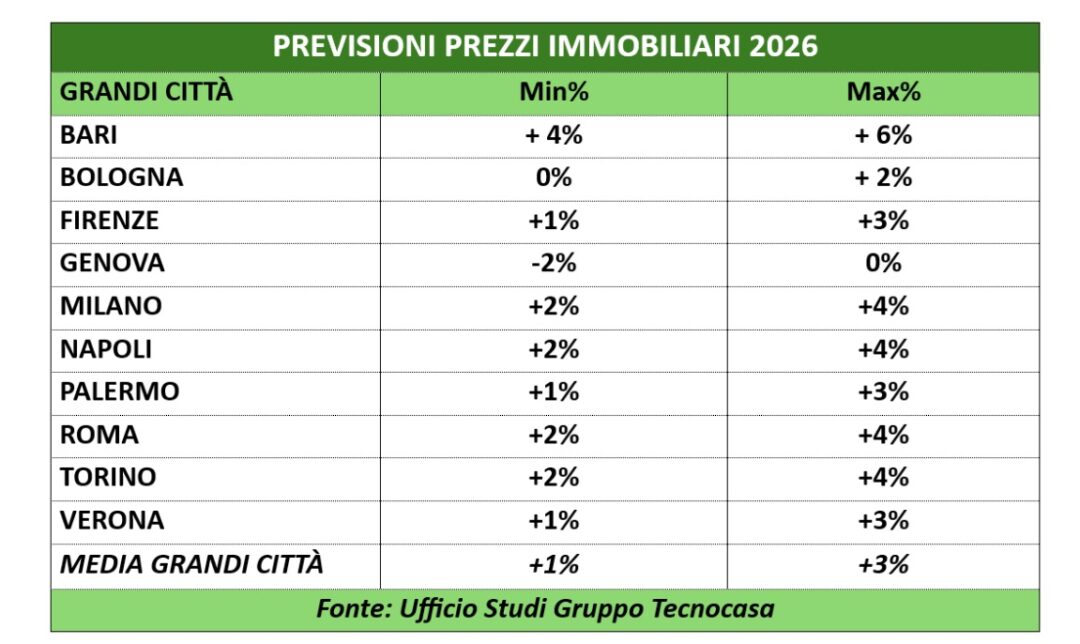 Previsioni positive sul mercato immobiliare italiano con prezzi ancora in aumento, ma non per Genova in cui nel 2026 è prevista una contrazione dei prezzi delle abitazioni fino al -2%. A dirlo è l’Ufficio Studi del Gruppo Tecnocasa.