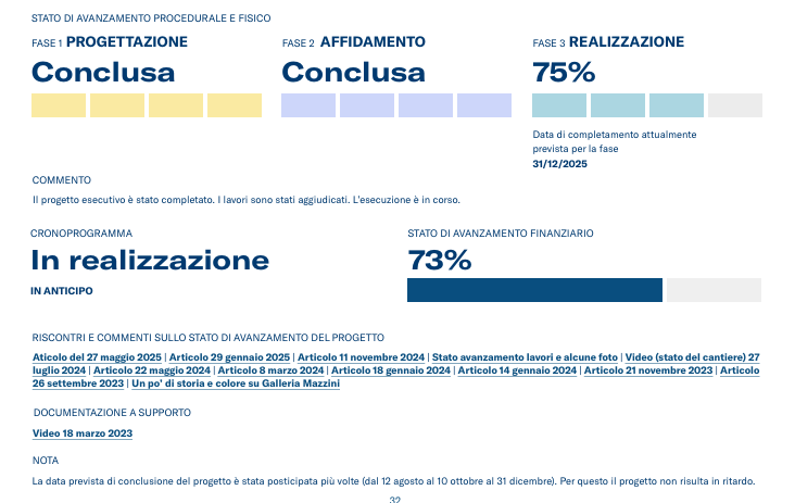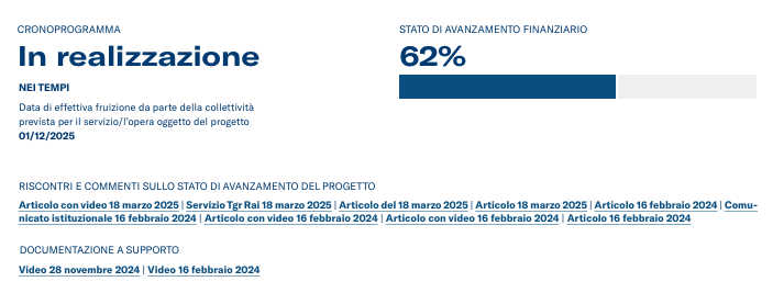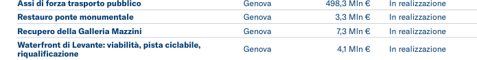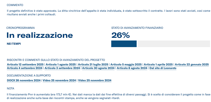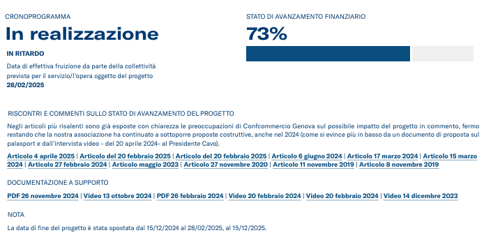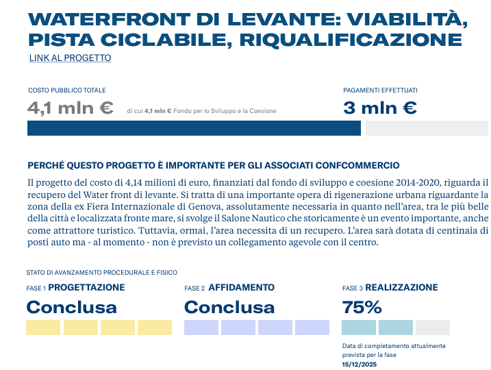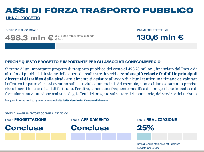 È online da oggi la seconda edizione del “Monitoraggio dei progetti pubblici per l’economia del territorio”, un report long form realizzato da Fondazione Openpolis e Confcommercio. Si tratta di un dossier nel quale vengono analizzati oltre 30 investimenti pubblici dislocati da nord a sud del Paese, finanziati dal piano nazionale di ripresa e resilienza (Pnrr) e dai fondi europei per la coesione. Sono 20 le città italiane oggetto del monitoraggio, 5 gli ambiti su cui i progetti insistono: commercio, cultura e turismo, infrastrutture, rigenerazione urbana, trasporto pubblico locale e mobilità dolce. L’iniziativa mira a promuovere trasparenza e un maggiore coinvolgimento dei corpi intermedi nell’attuazione di progetti strategici, scelti dalle Unioni regionali e dalle associazioni territoriali di Confcommercio, finanziati da Fondi strutturali o dal Pnrr e gestiti principalmente da enti locali e loro società. (Per il report completo vedi report-confcommercio-25-26.pdf ) A Genova vengono monitorati i seguenti quattro progetti: