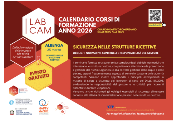 Labcam s.r.l., Laboratorio chimico Merceologico della Camera di Commercio Riviere di Liguria ha aperto le iscrizioni all’evento formativo gratuito “Sicurezza nelle strutture ricettive: obblighi normativi, controlli e responsabilità del gestore”, che si terrà il prossimo 25 marzo nell’Aula Formativa di Labcam ad Albenga (Regione Rollo, 98). L’incontro, organizzato in collaborazione con Asl2 e le principali associazioni di categoria, Federalberghi Savona e Upa Savona, nasce con l’obiettivo di fornire un supporto pratico e autorevole nella gestione dei rischi quotidiani del settore.