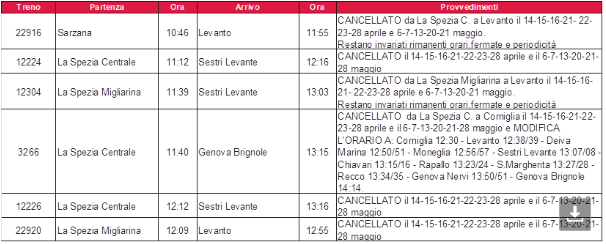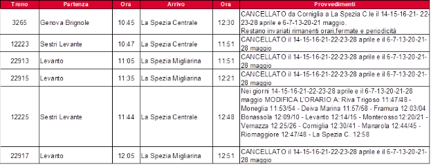 Rfi (Gruppo Fs) annuncia modifiche alla circolazione dei treni nella tratta La Spezia Migliarina- Corniglia per interventi infrastrutturali programmati alla Spezia Centrale dalle 11.15 alle 12.30 nelle giornate del 14, 15, 16, 21, 22, 23, 28 di aprile e 6, 7, 13, 20, 21, 28 nel mese di maggio.