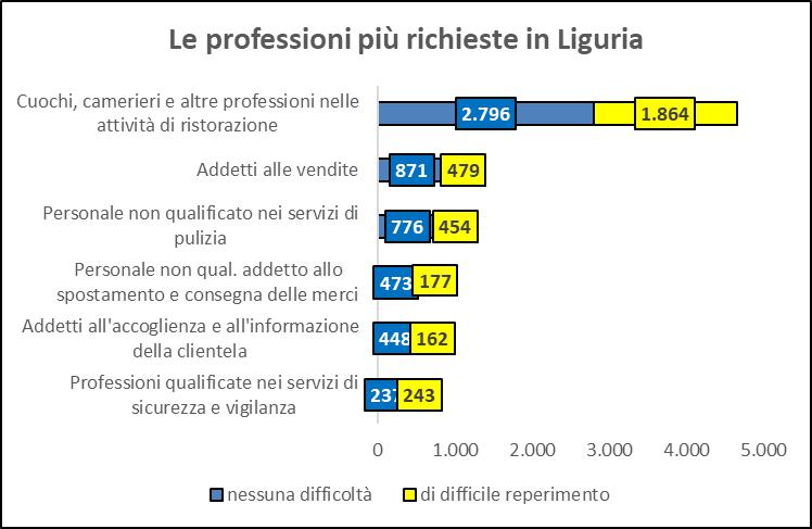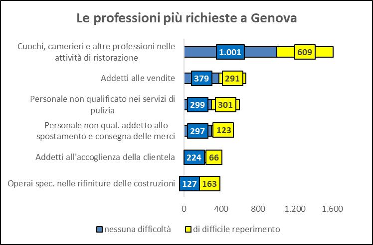 A trainare la domanda restano soprattutto i servizi e, in particolare, il comparto della ristorazione. Cuochi, camerieri e professioni affini si confermano nettamente in testa: 1.610 posizioni richieste a Genova e ben 4.660 in Liguria. Seguono gli addetti alle vendite (670 nel capoluogo e 1.350 a livello regionale) e il personale per i servizi di pulizia (600 a Genova e 1.230 in Liguria). Tra le figure più ricercate compaiono anche gli addetti alla logistica e consegna merci, il personale di accoglienza, oltre agli operai specializzati nelle rifiniture edilizie e, su scala regionale, i professionisti della sicurezza e vigilanza.