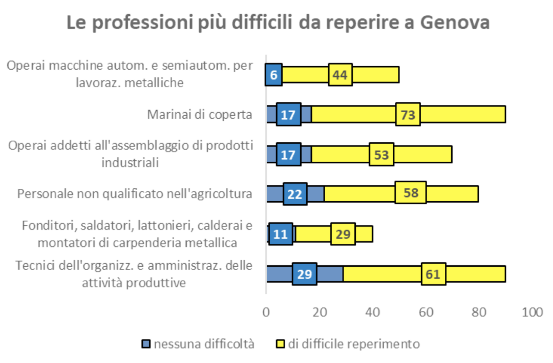 Non mancano tuttavia le criticità, soprattutto sul fronte del reperimento delle competenze. Le imprese genovesi segnalano forti difficoltà nel trovare operai specializzati per macchine automatiche e semiautomatiche nella lavorazione dei metalli (88% dei profili difficili da reperire), marinai di coperta (81%) e addetti all’assemblaggio industriale (76%). In Liguria, il dato più critico riguarda ancora i marinai di coperta, con una difficoltà che raggiunge il 91%, seguiti dai tecnici della gestione dei processi produttivi e dagli operai specializzati in ambito elettrico ed elettronico.