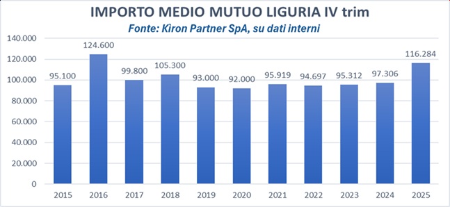 Per quanto riguarda la Liguria, l’importo medio a livello regionale con 95.100 euro nel 2015 ha avuto un andamento pressoché costante a esclusione di un picco di 124.600 euro del 2016, per arrivare all’attuale importo medio di 116.284 euro del 2025. I dati sono riferiti alle pratiche di mutuo gestite dalla rete di agenzie di mediazione creditizia Kìron Partner attive in Regione.